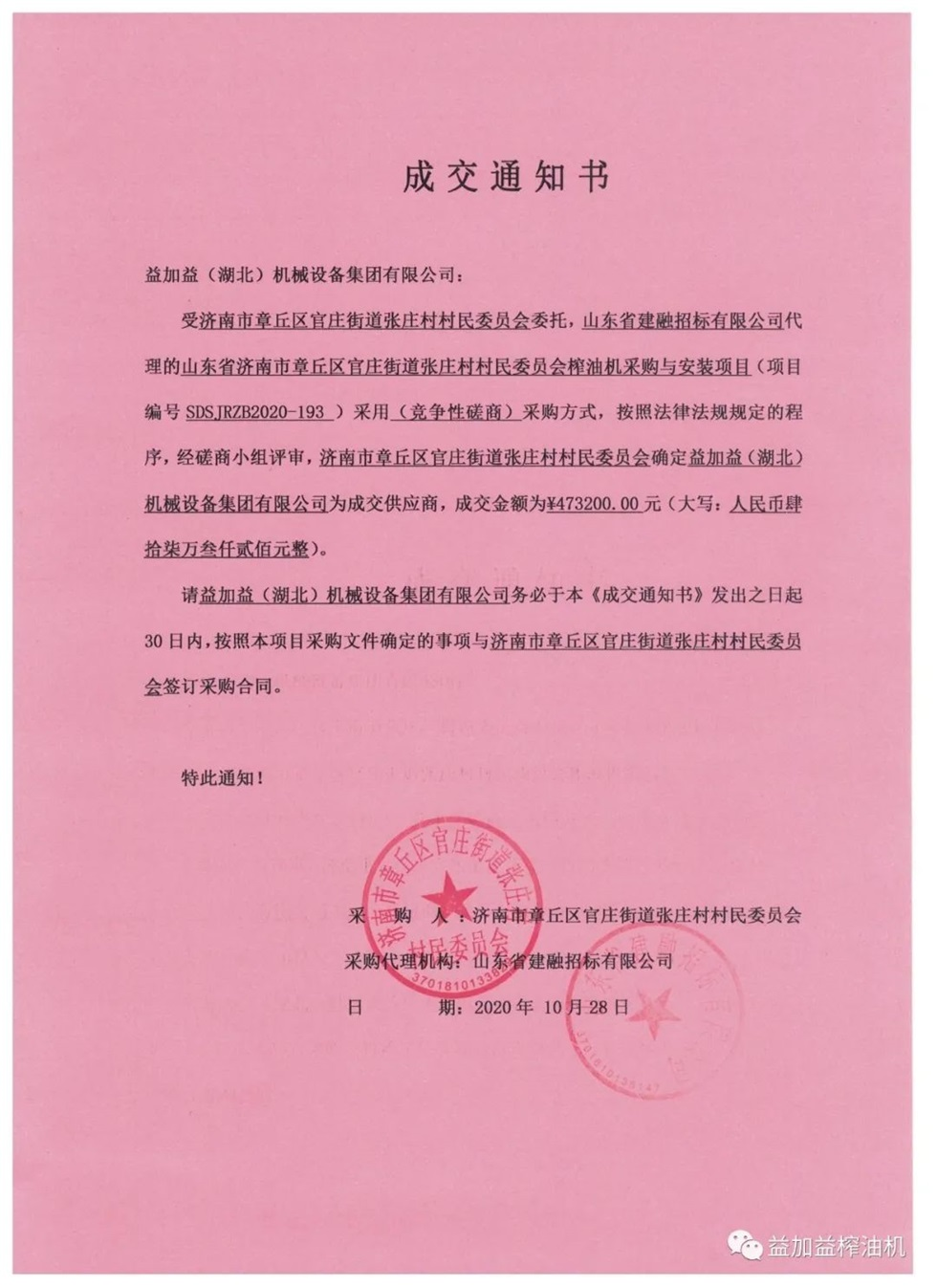 最近、益加益集團在山東省濟南市章丘區(qū)榨油機采購與安裝招標(biāo)項目的競標(biāo)中,憑借過硬的產(chǎn)品質(zhì)量,優(yōu)秀的新技術(shù),卓越的新工藝,新材料的應(yīng)用以及良好的企業(yè)信譽,以絕對優(yōu)勢順利中標(biāo)。